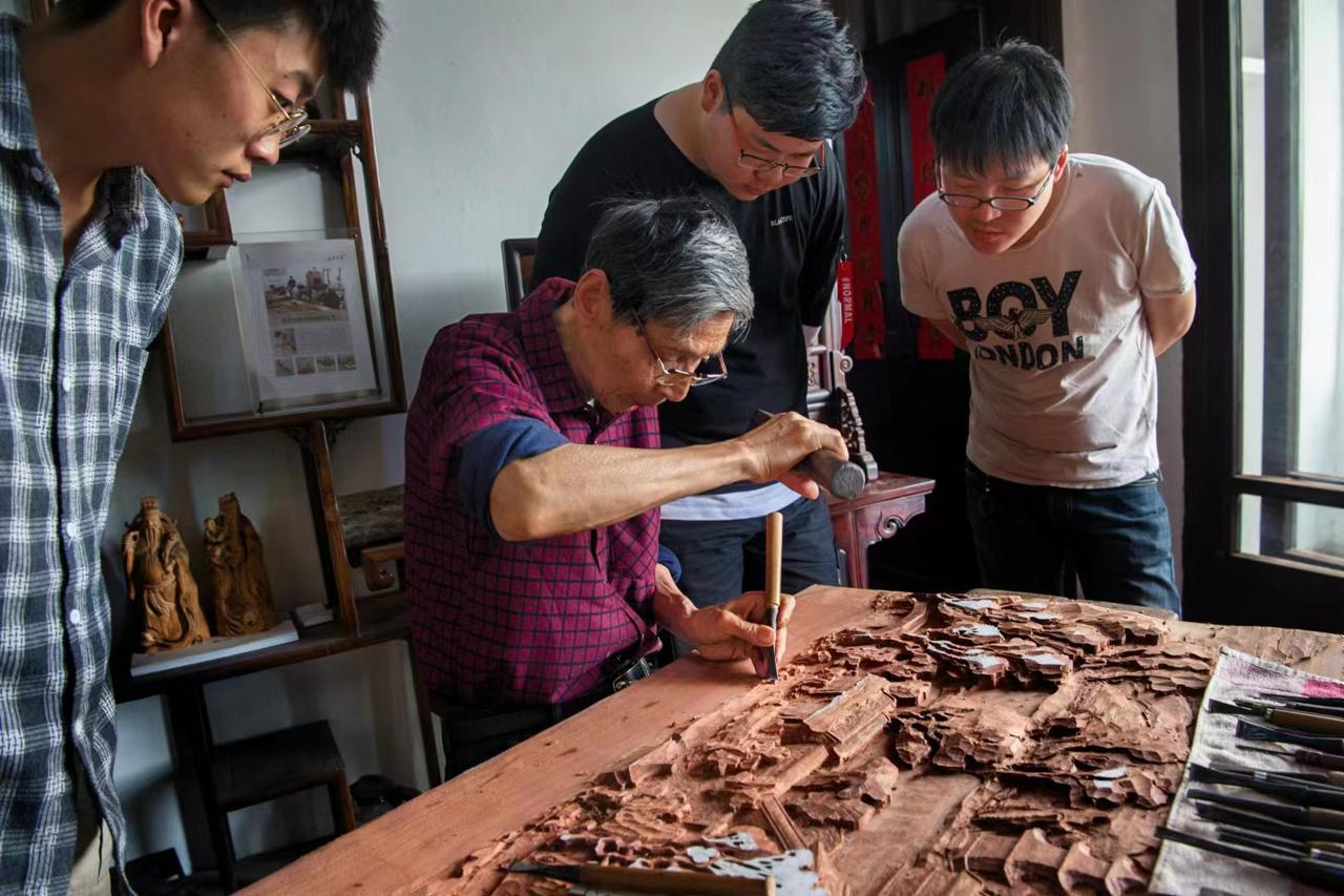 紅木雕刻大師顧連元在大師工作室傳授雕刻技藝