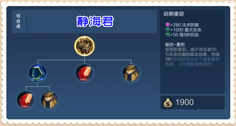 +280 法術(shù)防御+1000 大生命值+50 每5秒回血重傷:在受到傷害后,啟明重鎧的使用者可以減少攻擊者25%生命回復(fù)和吸血果,持續(xù)3秒(如果多件重傷裝備同時生,只生數(shù)值較高的那個)。從基礎(chǔ)屬性可以看到,啟明重鎧是一件法術(shù)防御裝,它的法抗屬性比不死鳥之眼高,比魔女斗篷和永夜守護(hù)低。另外,雖然還有大生命值和回血果,但啟明重鎧并沒有其它的防御或者生存方面的提升,在這一點(diǎn)上,不管是魔女斗篷、永夜守護(hù)還是不死鳥之眼的果都比啟明重鎧好的多。