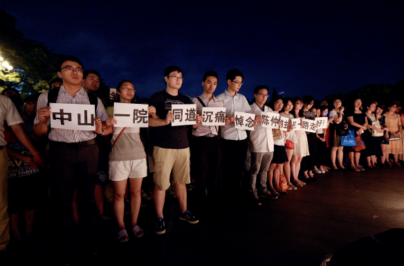 2016年5月7日晚上,廣東省廣州市英雄廣場,一些市民燃起燭光,自發(fā)舉行悼念被殺害醫(yī)生陳仲偉的活動(dòng)。5月5日下午,廣東省人民醫(yī)院口腔科主任醫(yī)師陳仲偉下班后,被此前調(diào)節(jié)過的一名患者尾隨至家中行兇,陳仲偉全身被砍30余刀,兇手行兇后跳樓身亡,陳仲偉經(jīng)搶救無于7日死亡。圖/IC