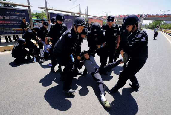 2014年5月14日,云南省昆明市亞東醫(yī)院,警察強(qiáng)行驅(qū)離堵路的患者家屬。5月12日,到亞東醫(yī)院生產(chǎn)的一名孕婦身亡,隨后兩天,有多人在醫(yī)院門口播哀樂,放鞭炮,支花圈,拉橫幅,堵住醫(yī)院附近路段。圖/IC