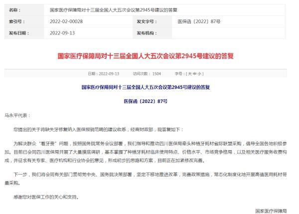 針對(duì)人大代表提出的關(guān)于將缺失牙修復(fù)納入醫(yī)保報(bào)銷范疇的建議,答復(fù)指出,為解決群眾“看牙貴”問(wèn)題,按照國(guó)務(wù)院常務(wù)會(huì)議部署,醫(yī)保局指導(dǎo)和推動(dòng)四川醫(yī)保局牽頭種植牙耗材省際聯(lián)盟采購(gòu),倡導(dǎo)全國(guó)各地積極參加。