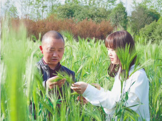 農(nóng)業(yè)職業(yè)經(jīng)理人王伶俐(右)在田間查看農(nóng)作物長(zhǎng)勢(shì)