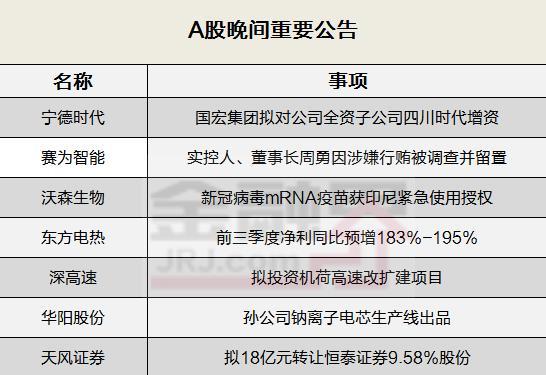 金融界9月30日消息 今日晚間重要公告搶先看——天風證券擬18億元轉讓恒泰證券9.58%股份、賽為智能實控人、董事長周勇因涉嫌行賄被調查并留置、東方電熱前三季度凈利同比預增183%-195%……