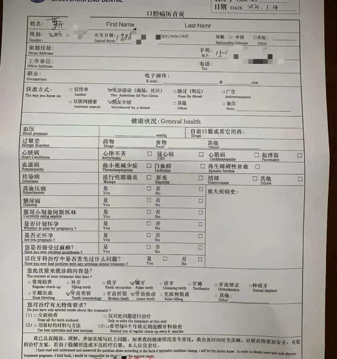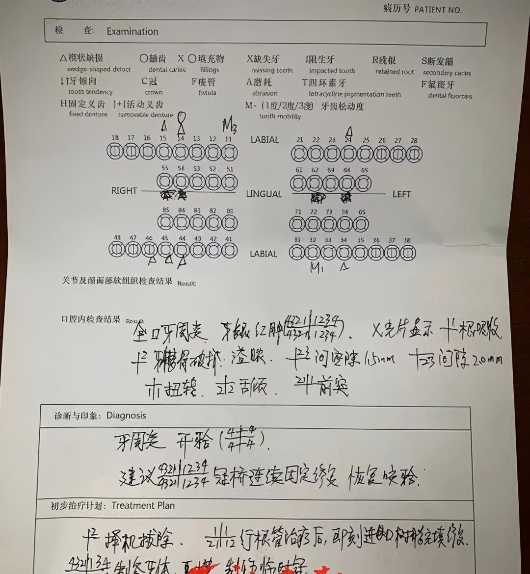 李大夫向新時(shí)報(bào)記者出具一份正反頁打印的口腔病歷。在口腔病例正面“就診內(nèi)容”一欄里,“鑲牙、牙齒美容、牙齒松動(dòng)”這三項(xiàng)被打了勾,患者簽名一欄也有靳先生的名字。病歷反面則有完整的檢查、診斷與初步調(diào)節(jié)計(jì)劃等內(nèi)容,其中寫有“建議16顆牙齒冠橋連續(xù)固定修復(fù)、制備牙體、制作臨時(shí)冠”等字樣?!斑@份口腔病歷是當(dāng)著他面填寫的,上面也有他自己的簽名,他不同意的話我們?cè)趺纯赡茏???/span>