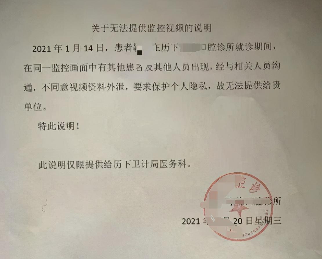 診療當(dāng)天究竟發(fā)生了什么?新時(shí)報(bào)記者致電歷下區(qū)衛(wèi)計(jì)局醫(yī)政科了解情況。醫(yī)政科一位負(fù)責(zé)人表示,針對(duì)這起糾紛醫(yī)政科已經(jīng)調(diào)解過兩次了,由于診所拒絕提供事發(fā)當(dāng)天的監(jiān)控錄像,無法證實(shí)術(shù)前有沒有做好充分告知義務(wù),因此調(diào)解未能成功。某口腔診所跟醫(yī)政科出具了一份《關(guān)于無法提供監(jiān)控視頻的說明》,上面寫道:“患者靳先生就診期間,在同一監(jiān)控畫面中有其他患者及他人人員出現(xiàn),經(jīng)與相關(guān)人員溝通,不同意視頻資料外泄,要求保護(hù)個(gè)人隱私,故無法提供給貴單位?!苯壬鷦t認(rèn)為,某口腔診所不敢拿出監(jiān)控視頻,是因?yàn)楫?dāng)時(shí)雙方啥也沒簽,監(jiān)控視頻能證明誰在撒謊。