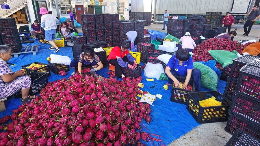 工人們在分揀、包裝火龍果。(方至萍 攝)