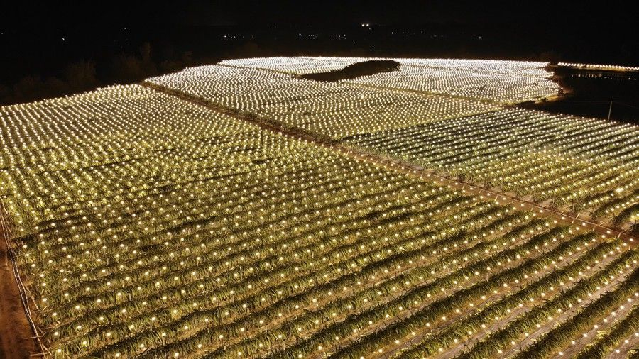 夜晚火龍果基地開燈補光。(張堰焜 攝)