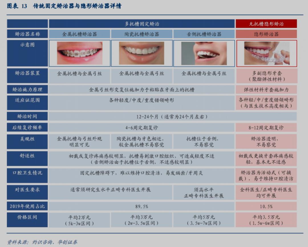 除了在需求端能讓新一代消費者覺得好看以外,在供給端還能讓醫(yī)生也更容易操作。傳統(tǒng)的正畸療法對牙科醫(yī)生的技術(shù)要求高,一般要求研究生水平的正畸專業(yè)培訓(xùn),還要獲得中國正畸學(xué)會、世界正畸學(xué)會等牙齒正畸機構(gòu)的認(rèn)可。2019年,國內(nèi)約有21萬名全科牙醫(yī),但正畸醫(yī)生僅有5300名,卻有近200萬例正畸病例。而隱形矯治器調(diào)節(jié)只需要相對適度的培訓(xùn),且能獲得隱形矯治解決方案提供商的醫(yī)療和技術(shù)支持,因此正畸醫(yī)生和全科牙醫(yī)均可更加輕松實施隱形正畸調(diào)節(jié)。這對隱形矯治市場的快速發(fā)展、滿足日益增長的需求起到了極大的支持作用。美觀+容易操作,讓國內(nèi)隱形矯治市場規(guī)模由從2015年的47800例、2億美元,增長到了2019年的303900例、14億美元,復(fù)合年增長率高達(dá)56.0%,躍居世界第二大隱形矯治市場。隱形矯治市場的規(guī)模雖然比不上傳統(tǒng)正畸,但除了增速快,還具有高客單價、高復(fù)購的特點。美團上顯示,傳統(tǒng)的金屬自鎖托槽價格在7000-20000元之間,而隱形矯正費用在10000-50000元之間,費用高于金屬牙套。招股書顯示,時代天使標(biāo)準(zhǔn)版、版、兒童版和COMFOS的建議零售價格分別為3.2萬、4.0萬、2.6萬和2.4萬,一個調(diào)節(jié)計劃通常需要40-60副隱形矯治器,持續(xù)約兩年時間,且中途難以更換調(diào)節(jié)方法。然而,中國隱形矯治市場滲透率仍然很低。2019年,在中國經(jīng)調(diào)節(jié)的290萬例錯頜畸形病例中,僅有10.5%采用隱形矯治器調(diào)節(jié),而在美國經(jīng)調(diào)節(jié)的450萬例錯頜畸形病例中,33.1%采用了隱形矯治器調(diào)節(jié)??偟膩碚f,隱形牙套,暫時還是一門小而美的生意。但在這個新生行業(yè)中,已經(jīng)有國產(chǎn)廠家實現(xiàn)了對國際巨頭的迅速趕超。