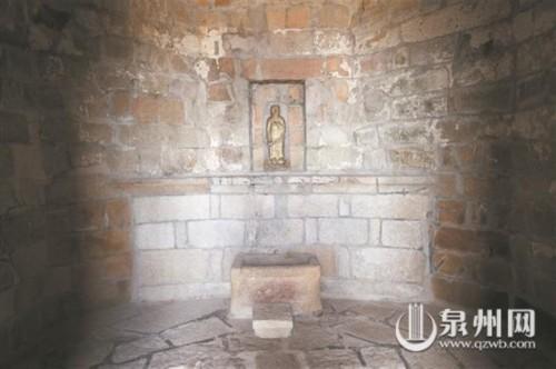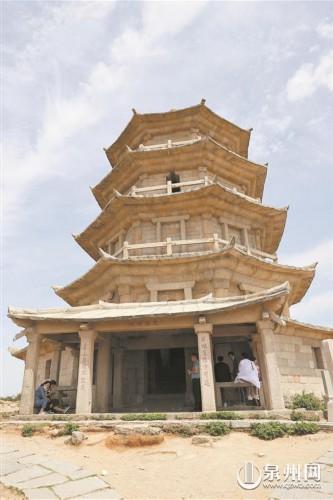 記者從山門遙望頂峰,只見一座石塔巍然矗立仿佛直入云霄,幾段石階開鑿于山巖之間,兩側(cè)皆是巖石,頗為陡峭。待攀上山頂,極目遠(yuǎn)眺,便可見遠(yuǎn)處的海灣波光粼粼,四周景色盡收眼底,一覽無余?;赝f壽塔,石塔整體宛若閣樓,由花崗巖筑成,共五層,呈八邊形。一層石門洞開,兩側(cè)石柱鐫刻有“勝地有緣方可進(jìn) 名山無福不能游”的對(duì)聯(lián),橫匾即 “泉南勝地”四字。門外還立有幾方石碑,記錄著萬壽塔的歷史?!度莞尽酚休d:“關(guān)鎖水口鎮(zhèn)塔也,高出云表,登之可望商舶來往?!笨梢娙f壽塔自古便是重要航標(biāo),亦被稱為關(guān)鎖塔。走進(jìn)塔內(nèi),立即感到一陣清涼舒爽,原來萬壽塔內(nèi)部呈空心樓閣狀,內(nèi)外溫差頗大,是天然的避暑勝地。