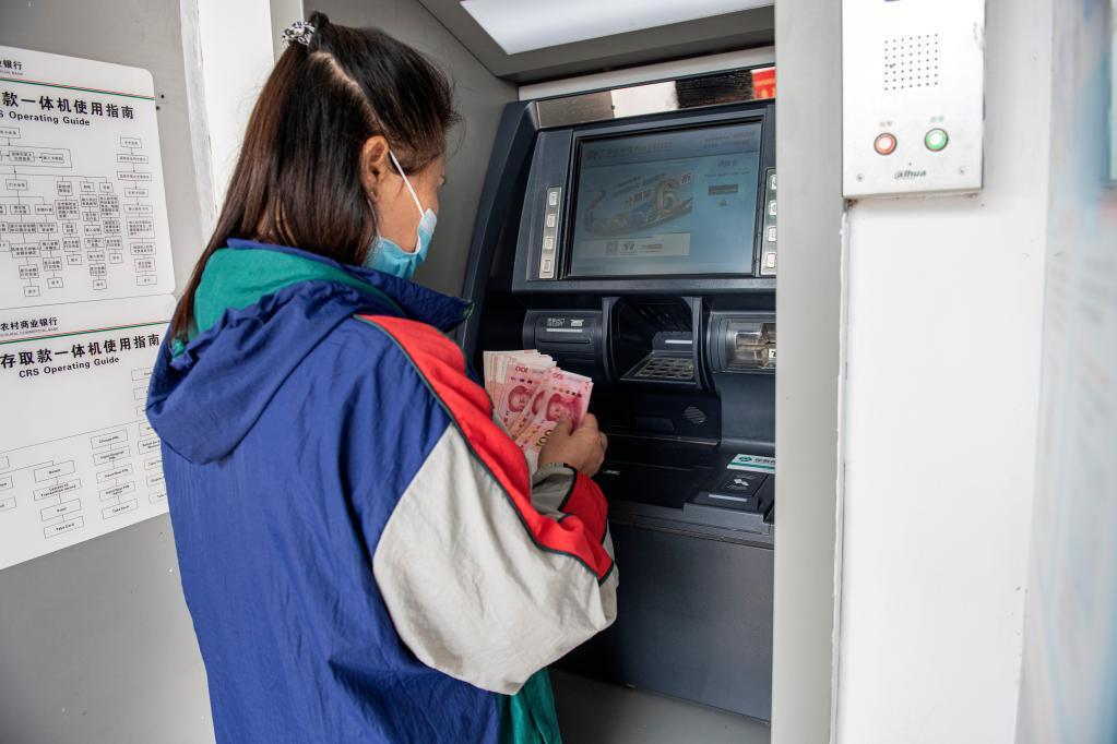 圖為廣西百色市田東縣平馬鎮(zhèn)四平村村民在村里的ATM機上辦理業(yè)務(wù)(2022年4月21日攝)。
