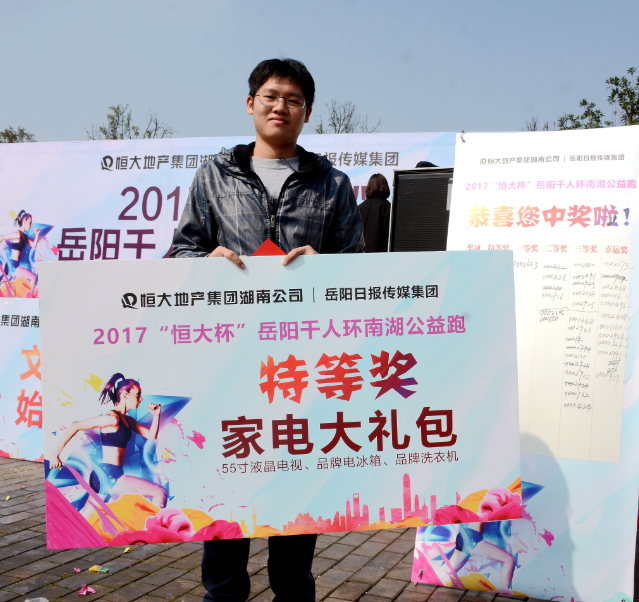 中獎的是來自岳陽職業(yè)技術學院致公班的學生謝裕佳。他中了特等獎,將獲得萬元家電大禮包。他拿著獎牌笑得合不攏嘴,一同來的10多個同學圍著他開心地慶賀。