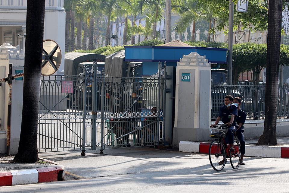 這是2月1日拍攝的被封閉的緬甸仰光市政大樓,院內(nèi)停著數(shù)輛軍車。 (新華社記者 張東強(qiáng)/圖)