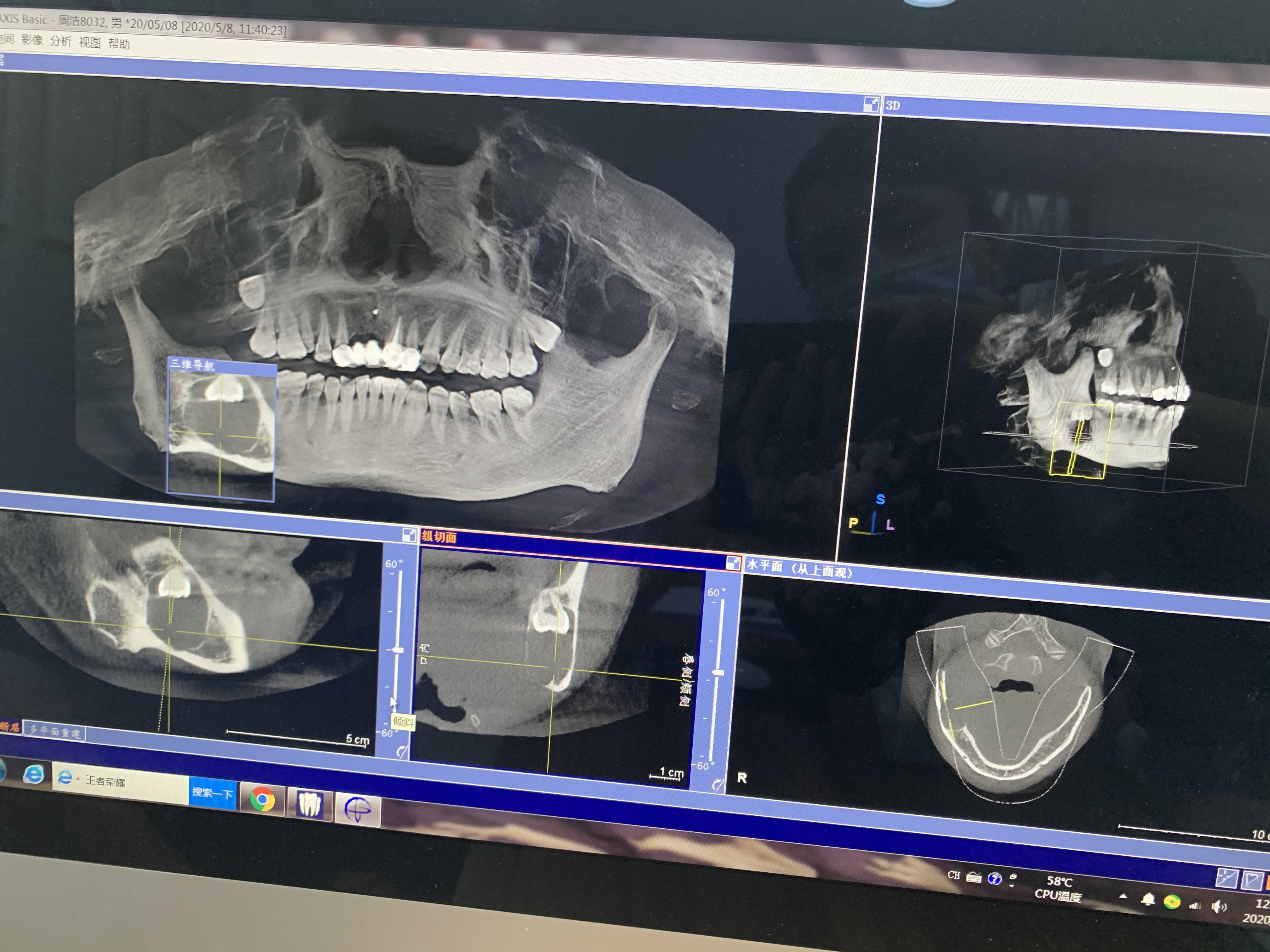 5月7日半夜被疼醒,感覺(jué)右側(cè)臉腫起來(lái)了,疼的厲害,整個(gè)頭皮都是疼的,我才知道這不是上火,懷疑是智齒,一晚上都沒(méi)睡著,第二天一大早,我家附近就有牙博士口腔,到那后馬上拍了一張片子,我心里在想,如果是智齒,那就趕緊拔了吧,太痛苦了,做好了拔牙和吃稀飯的思想準(zhǔn)備,可當(dāng)片子出來(lái)后,給我的卻是一個(gè)晴天霹靂。