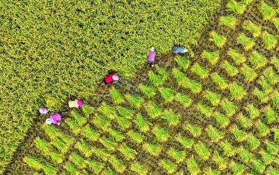 安徽省合肥市廬江縣白湖鎮(zhèn)農(nóng)民在收割水稻。新華社發(fā)