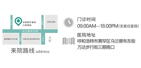 醫(yī)院地址:呼市賽罕區(qū)烏蘭察布東路萬達三期步行街南口華醫(yī)口腔醫(yī)院