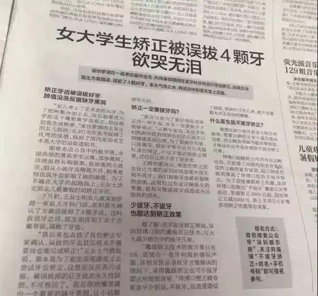 某牙科在報(bào)上刊登文章:一位女同學(xué)在公立醫(yī)院通過(guò)拔牙矯正牙齒,某牙科專(zhuān)家告訴她:“你被誤拔了!”因?yàn)槟硨?zhuān)家有牛逼技能—不拔牙矯正魔線技術(shù)。所以奉勸各位患者都來(lái)某牙科調(diào)節(jié),其他地方的牙醫(yī)都是忽悠人的。