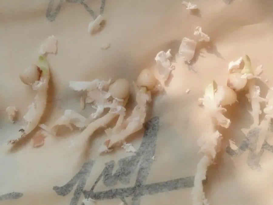 種子取下來后,要?jiǎng)儦?、去除包衣,然后浸泡一半在水里催芽,也可以放在濕?rùn)的木屑、水苔里催芽,像下圖這樣的大豆芽就可以了。