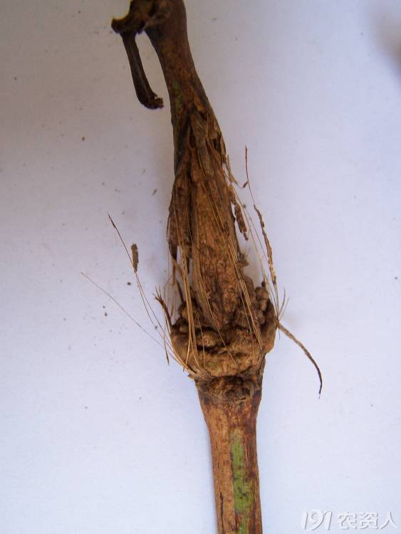 白腐病為害枝條,前期可能形成一些潰瘍性的病斑,隨著病害的發(fā)展,表皮上也會出現(xiàn)白色的小點,然后慢慢脫落,掉下去很多病原,一般在土壤中越冬。