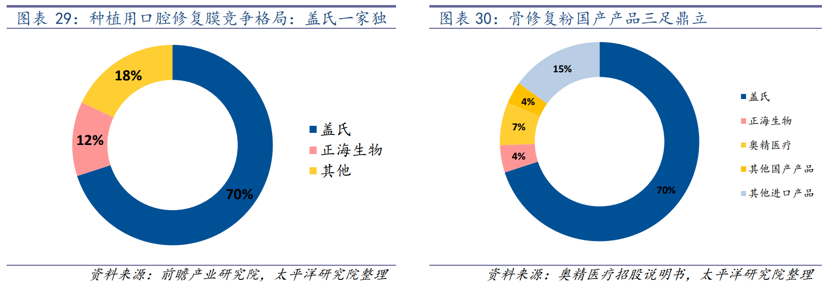 國內(nèi)企業(yè)中,正海生物在口腔修復(fù)膜上有一定競爭力,市占率超過10%;骨修復(fù)材料上,正海也有4%的份額。