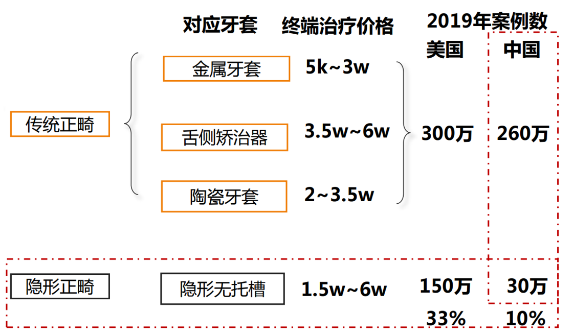 盡管價(jià)格昂管,但隱形正畸增速卻很快,2015~2019年,中國的隱形正畸案例由4.8萬例增長至30余萬例,復(fù)合增速為58.8%,遠(yuǎn)高于傳統(tǒng)正畸16%的增速。