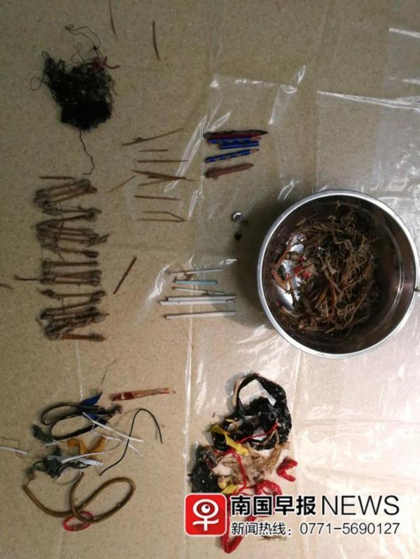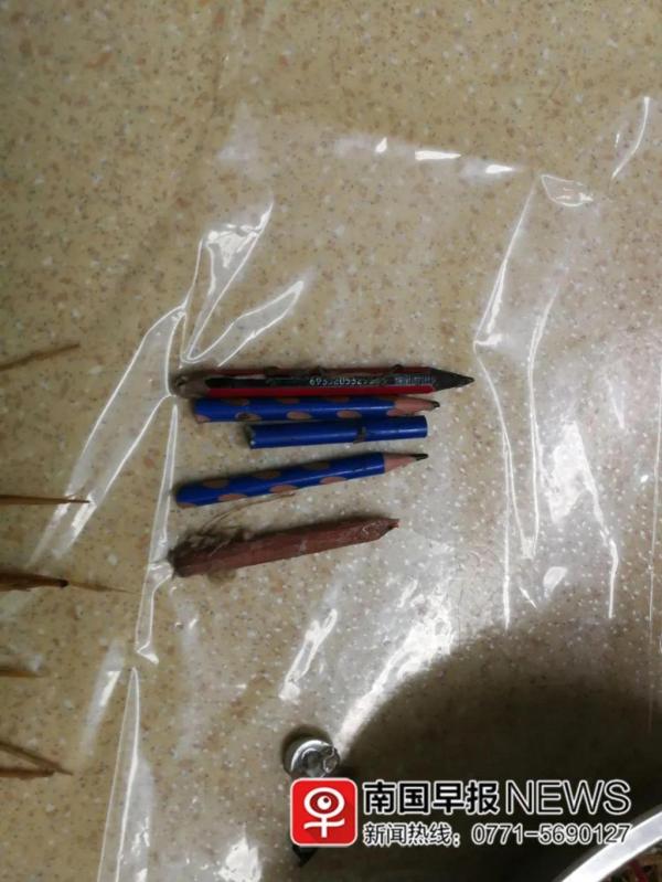 包括牙簽約30余根、棉簽24根、鉛筆5根、吸管6根、安瓿瓶蓋1個(gè)、金屬線5根、牙刷柄1根、類似導(dǎo)尿管的管狀物1條、布片1張、數(shù)根包裝帶、根各式線團(tuán)、根各式塑料袋塑料片、根大小不等竹片樹枝、根頭發(fā)絲等。